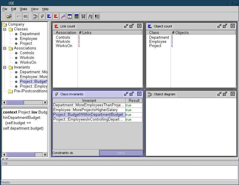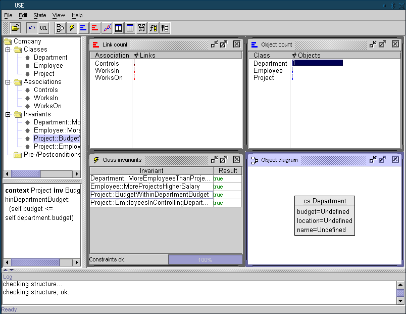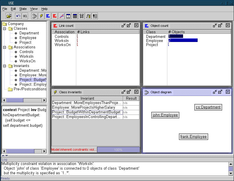 We have seen that class invariants are checked automatically each time a system state changes. This section shows how invariants can be analyzed. We continue the example by adding two projects and linking them to the existing employees and the department: