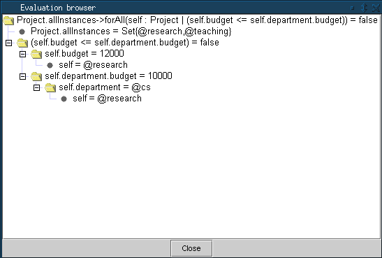 The root node in the evaluation browser shows the complete expression and its result (which is false for the chosen invariant). For each component of an expression there are child nodes displaying the sub-expressions and their results. You can see that the argument expression of the forAll quantifier is false, thus making the whole expression result false. In this sub-expression, the variable self is bound to the object research. The evaluation browser has helped to find out that it is the budget attribute value of this object which causes the invariant to fail.